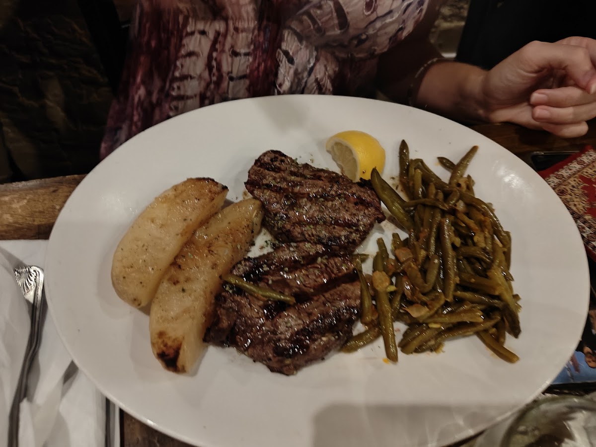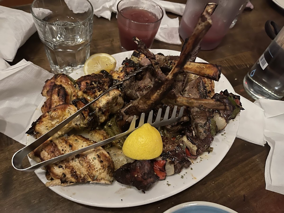 The food here was amazing! Came with my husband to grab a bite before going to a comedy show and it was great. The vibe was really nice and we got to sit outside at one of the nice high tables. We saw the belly dancer pass through and also our server was extremely attentive to us. We were seated immediately and food was brought out promptly. I remember my husbands virgin pina colada being AMAZING and my drink was delicious as well. I definitely recommend it here. The potatoes the meat skewers came with were really yummy too