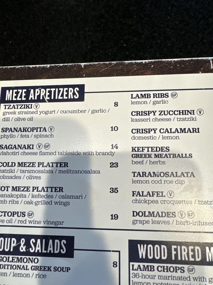 Keftedes, spanakopita, lamb ribs, grilled wings, and calamari.
